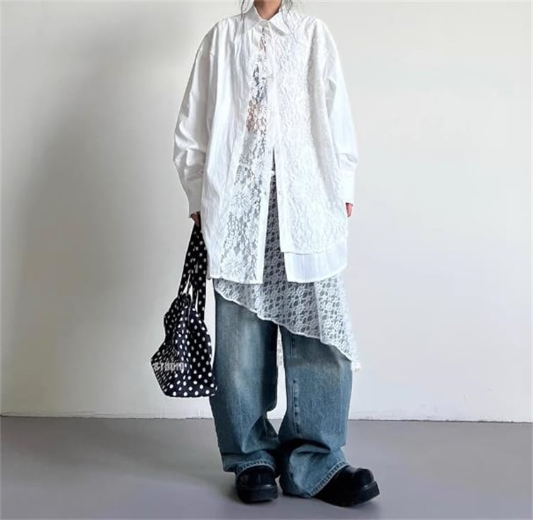 魅力を醸し出す 激安セール ルーズフィット ロングスリーブシャツ レースミックスツーウェイトップス
