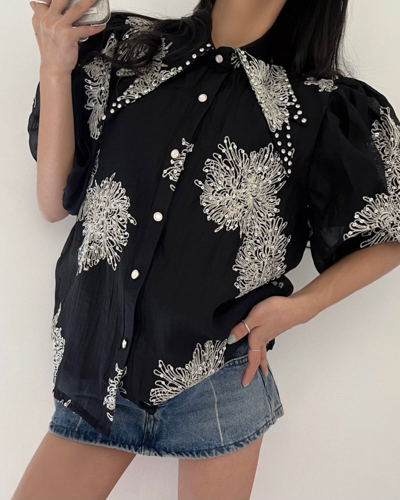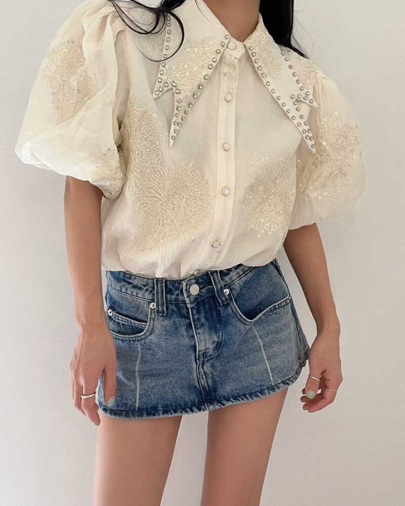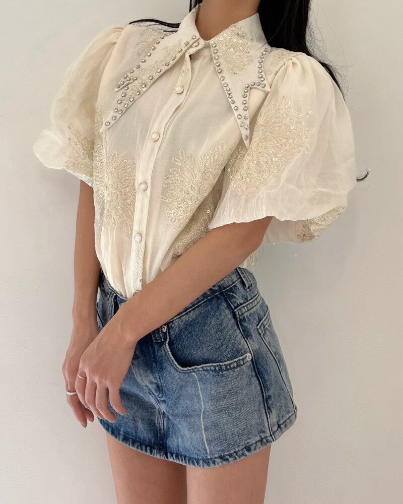 ふんわりとしたシルエットが魅力の、ランタンスリーブが印象的なデザインブラウス。